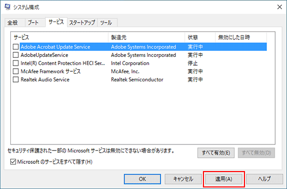 ※ 仕様上、無効にできないサービスは「適用」をクリックした後に再度チェックが入りますが、そのまま次のステップに進んでください。