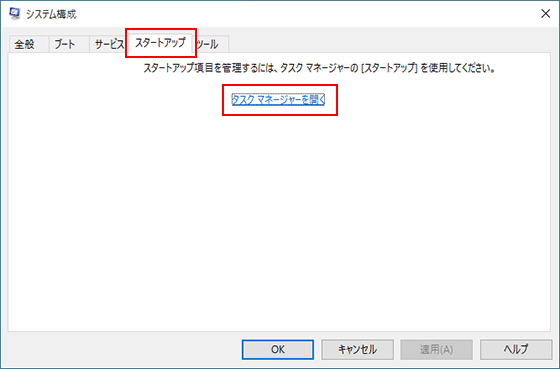 スタートアップタブを選択し、「タスクマネージャを開く」をクリックします。