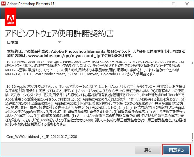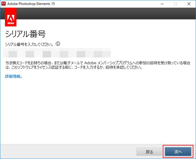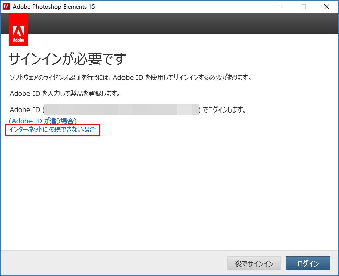 インストールした Photoshop Elements 15、Premiere Elements 15 を起動すると以下のログイン画面が表示されます。