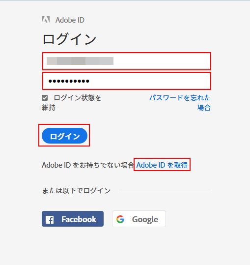 Adobe ID とパスワードを入力し、「ログイン」をクリックします。Adobe ID 未登録の場合は、「Adobe ID を取得」をクリックして作成します。