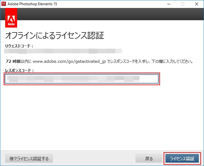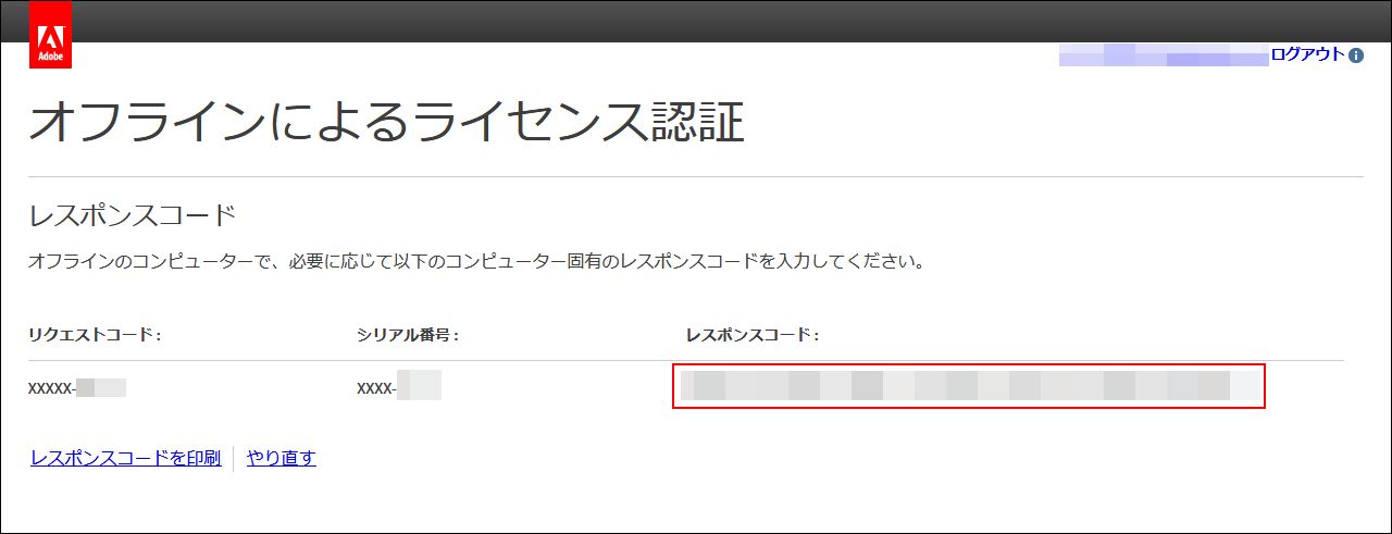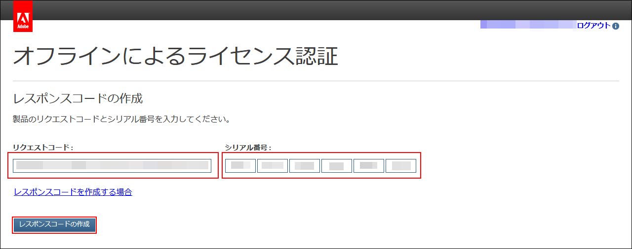 手順 9. でメモしたリクエストコードと製品のシリアル番号を入力し、「レスポンスコードの作成」ボタンをクリックします。