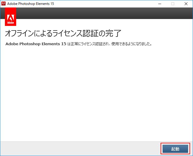 オフラインによるライセンス認証の完了の画面が表示されたら「起動」をクリックします。