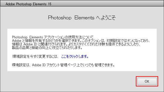 「Photoshop Elements へようこそ」が表示されたら「OK」をクリックします。