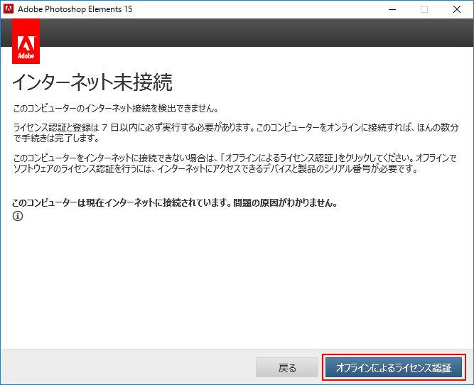 インターネット未接続の画面が表示されるので、「オフラインによるライセンス認証」をクリックします。