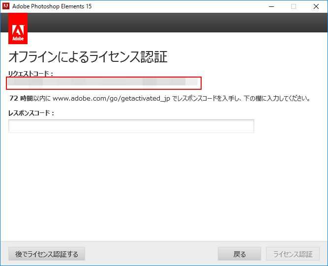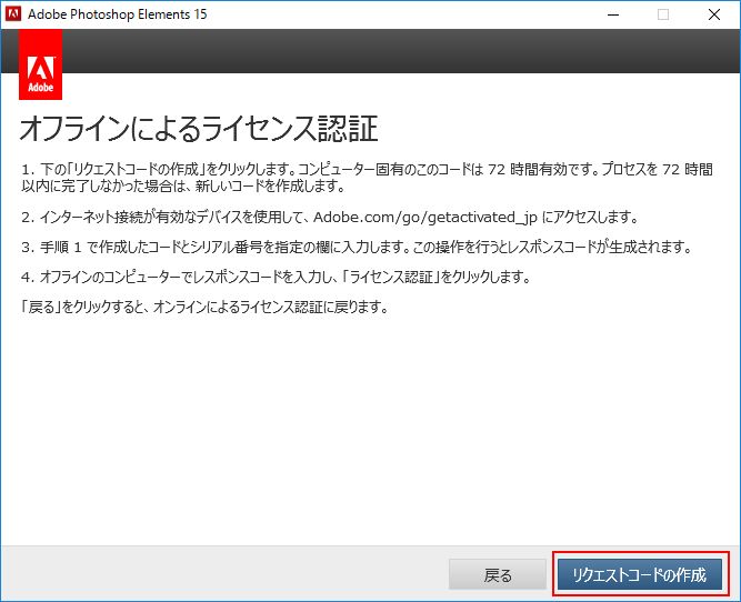 オフラインによるライセンス認証の画面が表示されたら、「リクエストコードの作成」をクリックします。