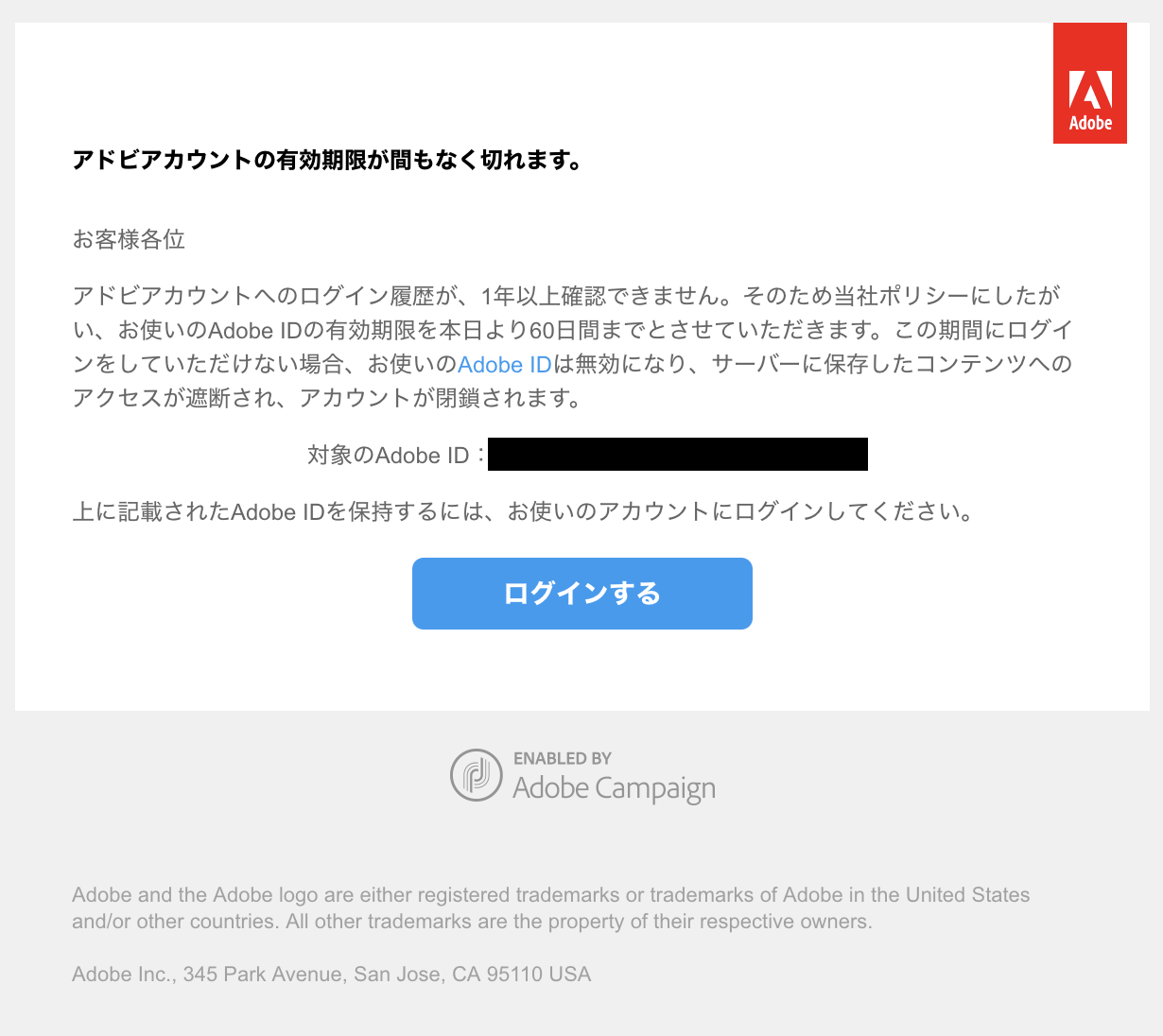 Adobeでは、お客様が1年以上ご利用されていないAdobe IDについて、当社のポリシーに則って削除させていただいており、事前にメールにてお客様に通知させていただいています。