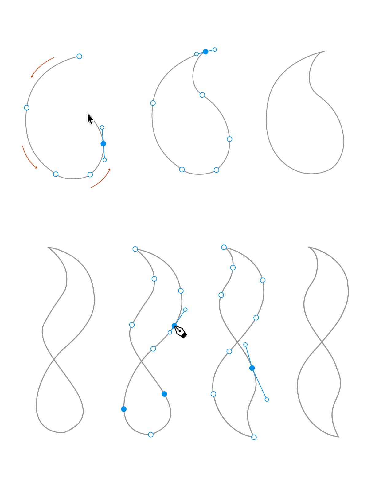 ペンツールで描画しているときは、新しいセグメントを描画するだけではなく、上記のすべての編集をおこなうことができます。