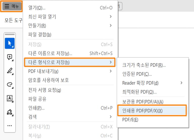 Acrobat에서 PDF를 열고 햄버거 메뉴(Windows) 또는 파일 메뉴(macOS) > 다른 이름으로 저장 > 인쇄용 PDF (PDF/X)를 선택하세요.