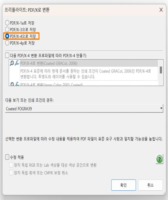 프리플라이트 대화 상자에서 PDF/X-4로 저장을 선택하고 확인을 선택하세요.