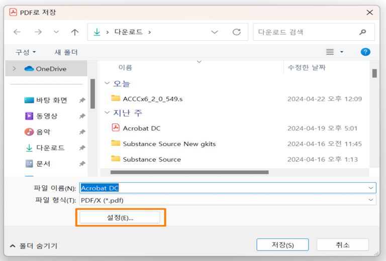 다른 이름으로 저장 대화 상자에서 설정을 선택하세요.