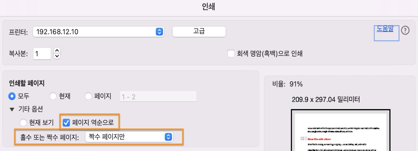 인쇄 대화 상자의 인쇄할 페이지 섹션에서 페이지 역순으로를 선택하고 홀수 페이지만을 선택합니다. 이 시나리오에서는 페이지 역순으로 옵션을 사용하여 페이지 순서가 올바른지 확인합니다.