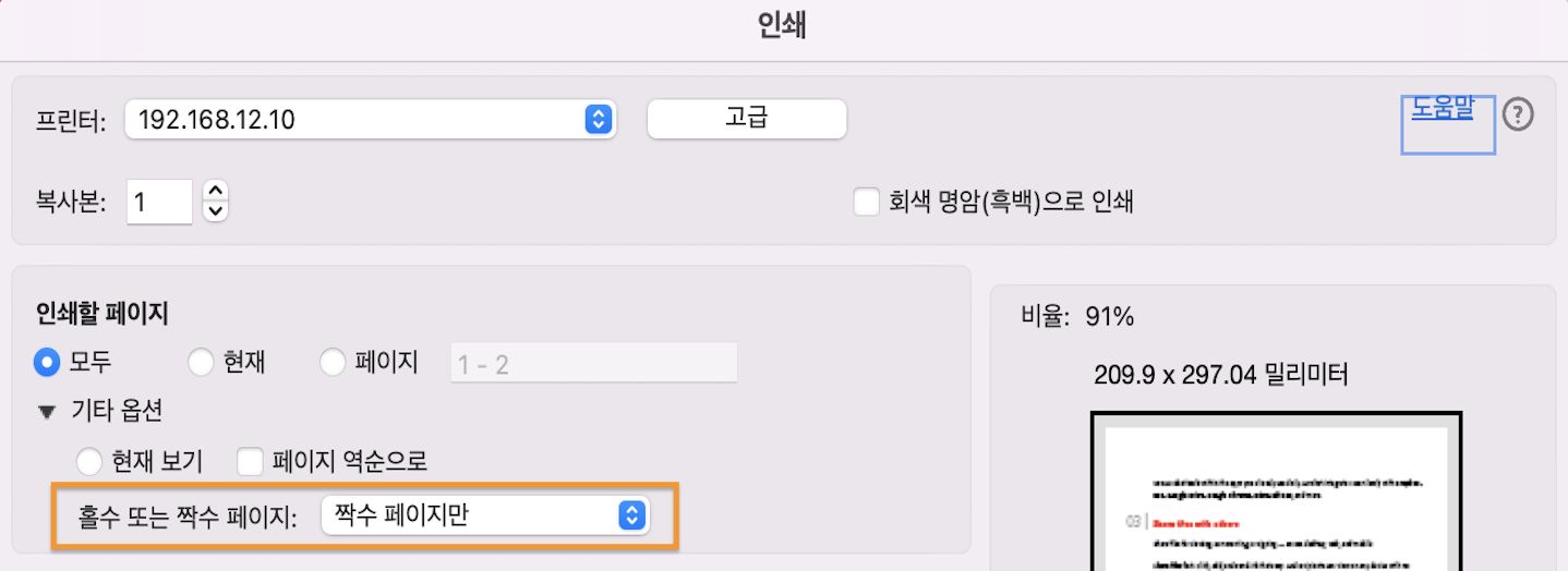 인쇄 대화 상자의 인쇄할 페이지 섹션에서 짝수 페이지만을 선택합니다.