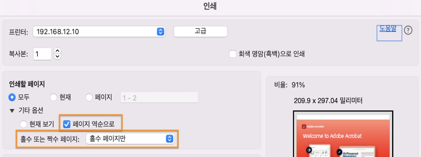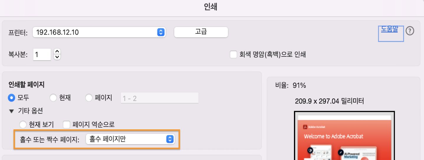 햄버거 메뉴(Windows) 또는 파일 메뉴(macOS) > 인쇄를 선택하고 인쇄 대화 상자의 인쇄할 페이지 섹션에서 홀수 페이지만을 선택합니다. (이번에는 [페이지 역순으로]를 선택하지 마십시오.)