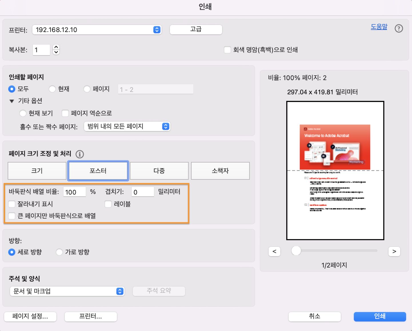 인쇄 대화 상자의 페이지 크기 및 취급 섹션에서 포스터를 선택하세요.