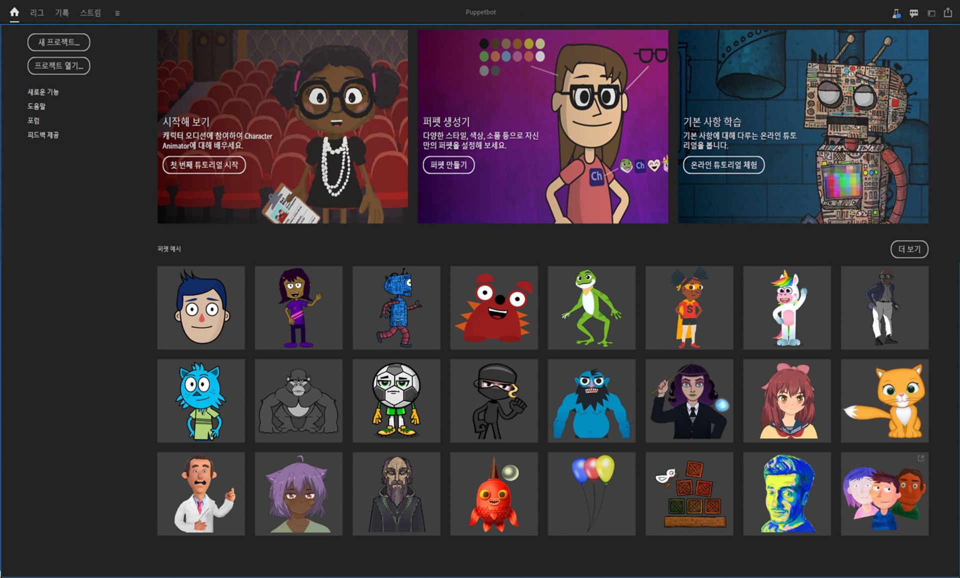 애플리케이션을 시작하면 [홈] 화면이 나타납니다. 작업 영역에는 인터랙티브한 시작 비디오 튜토리얼 같은 리소스, 웹상의 유용한 리소스 및 템플릿 퍼펫이 포함되어 있습니다. 이러한 리소스를 활용해 Character Animator 사용법을 익히거나 템플릿 퍼펫 애니메이션 테스트를 시작할 수 있습니다.