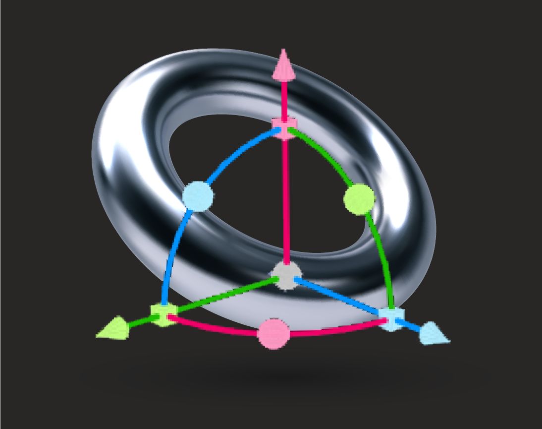 [3D 변형 기즈모]를 사용하여 하나의 도구 내에서 3D 레이어의 비율을 조정하고, 배치하고, 회전합니다. 이전의 변형 기즈모와는 다르게, 이 도구는 더 빠르고 직관적이며 모든 공간 조작 도구를 하나로 제공합니다. 동일한 도구 내에서 각 축을 변형할 수 있는 차원과 유사하게 작동합니다. 위치, 크기 조절, 회전 등 별도의 속성으로 이동하여 조작할 필요가 없습니다.