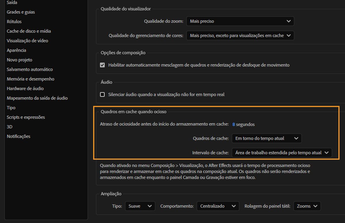 After Effects는 유휴 상태에서 설정된 시간이 지난 후 컴포지션을 자동으로 렌더링합니다.그래서 사용자가 휴식 시간을 끝내고 돌아오면 After Effects는 미리 보기를 재생할 준비가 되어 있습니다. 기본 유휴 시간은 8초로 설정됩니다.설정을 변경하려면 After Effects > 환경 설정 > 미리 보기를 선택합니다. 유휴 상태에서 프레임 캐싱 섹션 아래에는 다음과 같은 옵션이 있습니다.