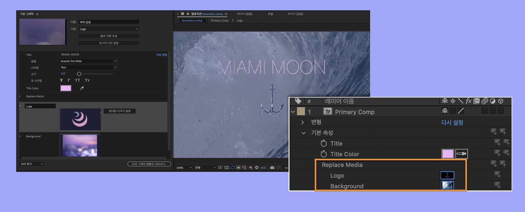 미디어를 바꿀 수 있는 모션 그래픽 템플릿을 만들고 기본 속성으로 미디어 교체를 사용하는 방법을 알아봅니다.