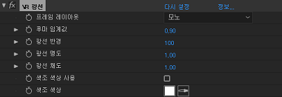After Effects의 포스트 효과는 원활하게 편집할 수 있습니다. 심을 따라 발생하는 왜곡 없이 스티치된 360 푸티지에 효과를 직접 적용할 수 있습니다. 다음 효과를 비디오에 추가하여 몰입형 환경을 개선할 수 있습니다.