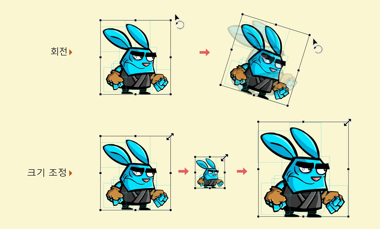 변형 툴을 사용하는 방법에 대한 자세한 내용은 그래픽 객체 변형 및 결합 문서를 읽어보십시오.