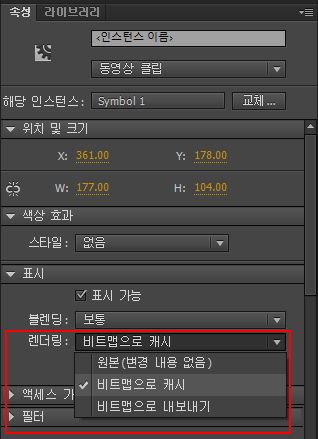 MovieClip 심볼에 대해 [비트맵으로 캐시] 속성을 활성화하려면 MovieClip 인스턴스를 선택하고 속성 관리자([윈도우] > [속성])의 [렌더링] 드롭다운에서 [비트맵으로 캐시]를 선택합니다.