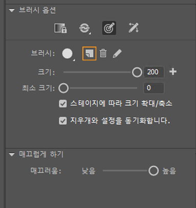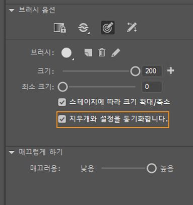 - 브러시 도구(B)의 지우개와 설정 동기화 확인란을 활성화합니다.