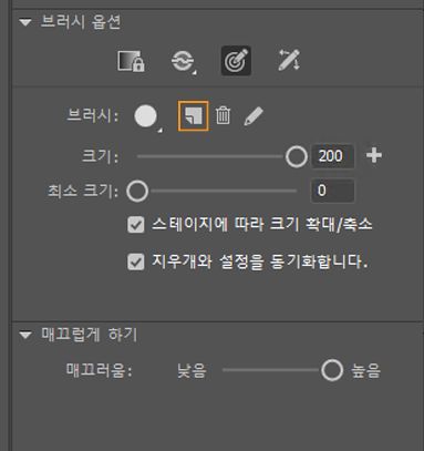 - 브러시 도구(B)의 현재 설정은 지우개(E) 도구에서 미러링되며 반대로 됩니다.