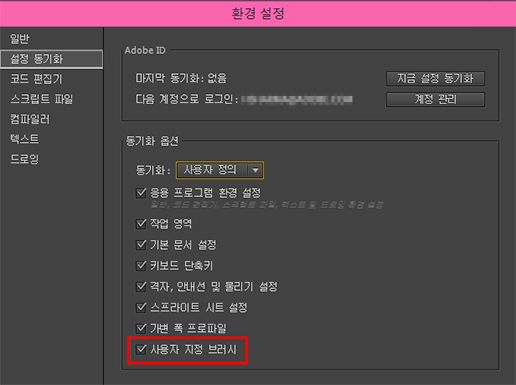 직접 만든 사용자 정의 브러시를 Animate 환경 설정을 통해 클라우드와 동기화할 수 있습니다. 이렇게 하려면 [편집] > [환경 설정](Windows) 또는 [Animate] >[환경 설정](Mac)으로 이동합니다. "설정 동기화" 섹션 내에서 사용자 정의 브러시를 동기화하는 옵션은 아래에 나와 있습니다.