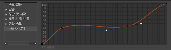 사용자 정의 속도 그래프는 시간 경과에 따른 모션 정도를 나타냅니다. 가로축은 프레임 수를 나타내고 세로축은 트윈의 변경률을 나타냅니다. 애니메이션의 첫 번째 값은 0%이고 마지막 키프레임은 0% ~ 100%로 설정될 수 있습니다. 트위닝된 인스턴스의 변경률은 그래프의 곡선 기울기로 표시됩니다. 그래프에 가로 선(기울기 없음)을 생성하면 속도는 0이고 그래프에 세로 선을 생성하면 속도가 즉시 변경됩니다.