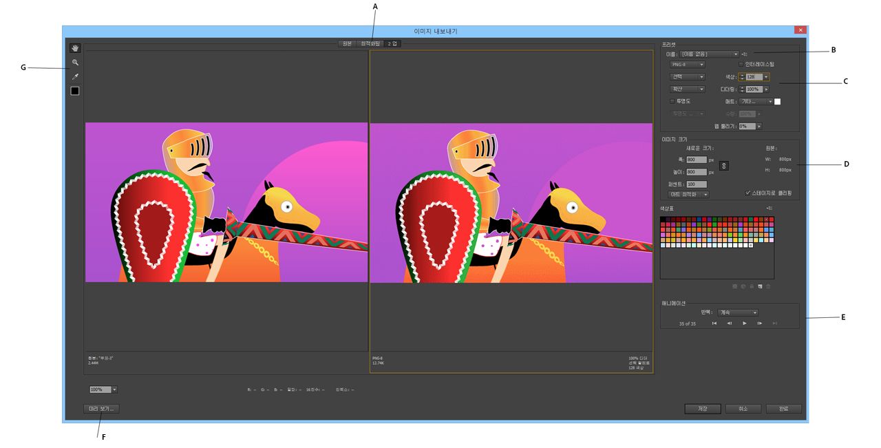 A. 표시 옵션 B. 최적화 팝업 메뉴 C. 프리셋 옵션 D. 이미지 크기 옵션 E. 애니메이션 옵션 F. 미리 보기 G. 툴 모음