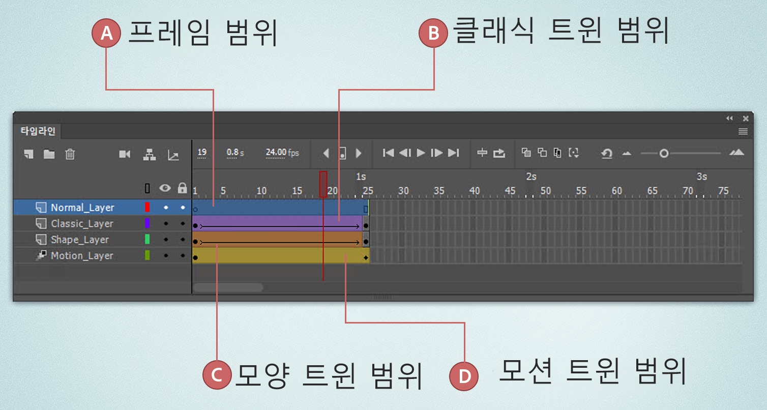 트위닝된 프레임 범위에서는 각 프레임의 범위 내에서 컨텐츠가 변경됩니다. 이 유형의 범위는 애니메이션에 사용할 수 있습니다.