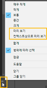 타임라인 패널의 오른쪽 위 모서리에 있는 [옵션] 메뉴에서 [미리 보기]를 선택합니다.