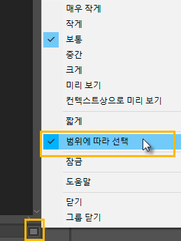 범위에 따른 프레임 선택을 위한 전제 조건으로, 오른쪽 위 모서리에 있는 햄버거 모양 아이콘을 클릭하고 범위에 따라 선택 메뉴 항목을 선택하여 Animate 타임라인에서 범위에 따른 선택을 지정할 수 있습니다.