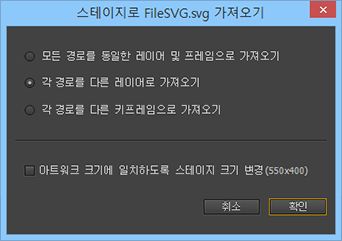 - 아트워크 크기에 일치하도록 스테이지 크기 변경: 가져올 SVG 파일의 아트워크 크기에 맞춰 스테이지 크기를 늘리거나 줄이려는 경우 이 옵션을 선택합니다.