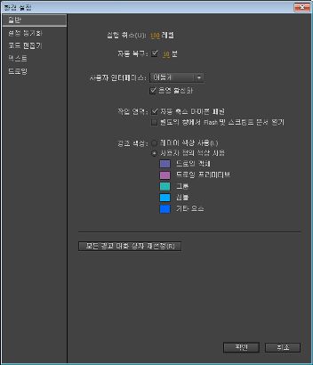 사용되는 경우(기본 설정) 이 설정은 열려 있는 각 파일의 복사본을 지정된 시간 간격마다 원본과 동일한 폴더에 저장합니다. 아직 파일을 저장하지 않은 경우에는 Flash에서 사본을 해당 Temp 폴더에 저장합니다. 파일 이름은 원본과 같지만 맨 앞에 "RECOVER_"가 추가됩니다. Flash Pro가 예상치 못하게 종료되는 경우 다시 시작할 때 자동 복구 파일을 열 수 있는 대화 상자가 나타납니다. Flash Pro를 정상적으로 종료하면 자동 복구 파일이 삭제됩니다.