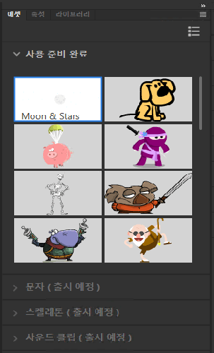 최신 버전의 Animate에는 문서 전체에서 바로 사용할 수 있는 에셋을 저장, 관리, 재사용할 수 있는 에셋 패널이 있습니다. [라이브러리] 패널의 컨텍스트 메뉴에서 모든 이미지 또는 기호를 에셋으로 내보낼 수 있습니다.에셋을 내보낸 후에는 메뉴 > 가져오기를 사용하여 [에셋] 패널로 가져올 수 있습니다.