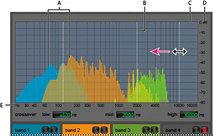 각 밴드의 폭을 결정하는 크로스오버 주파수를 설정합니다. 특정 [낮음], [Midrange], [높음] 주파수를 입력하거나 크로스오버 마커를 그래프 위로 드래그합니다.