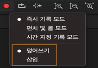 파형 편집기의 새로운 삽입 모드를 사용하면 덮어쓰지 않고 재생 헤드 위치에 오디오를 삽입할 수 있습니다. 이 기능은 파형 편집기의 음성 작업 과정에 특히 유용합니다. 또한 [레코딩 삽입] 모드에서는 펀치 및 롤 기능을 지원해 새 세그먼트를 레코딩하기 전에 이전 오디오를 미리 볼 수 있습니다. 이렇게 하면 기존 퍼포먼스의 리듬과 표현에 보다 쉽게 일치시킬 수 있습니다.오디오를 덮어쓰려면 덮어쓰기 모드를 선택합니다.