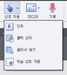 대화형 개체를 사용하려면 큰 단추 막대에서 상호 작용을 클릭하고 메뉴에서 원하는 개체를 선택합니다.