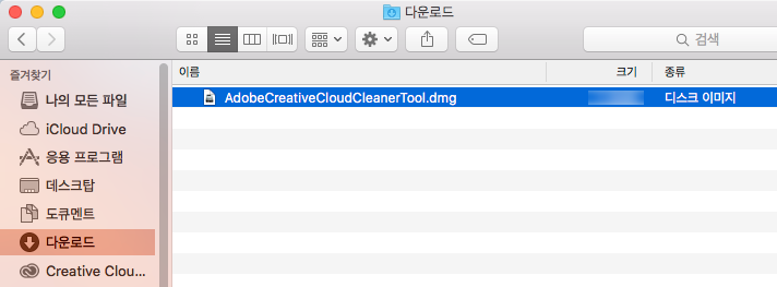 Adobe Creative Cloud Cleaner Tool을 실행하려면 AdobeCreativeCloudCleanerTool.dmg 파일을 더블 클릭합니다.