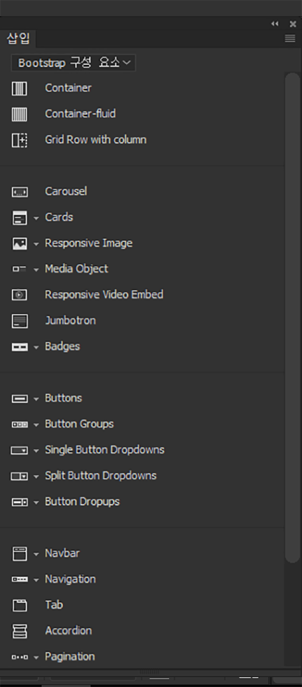 - 강조되는 문서: 삽입 패널의 구성 요소는 해당 문서에 연결된 Bootstrap 파일의 Bootstrap 버전을 기준으로 채워집니다.