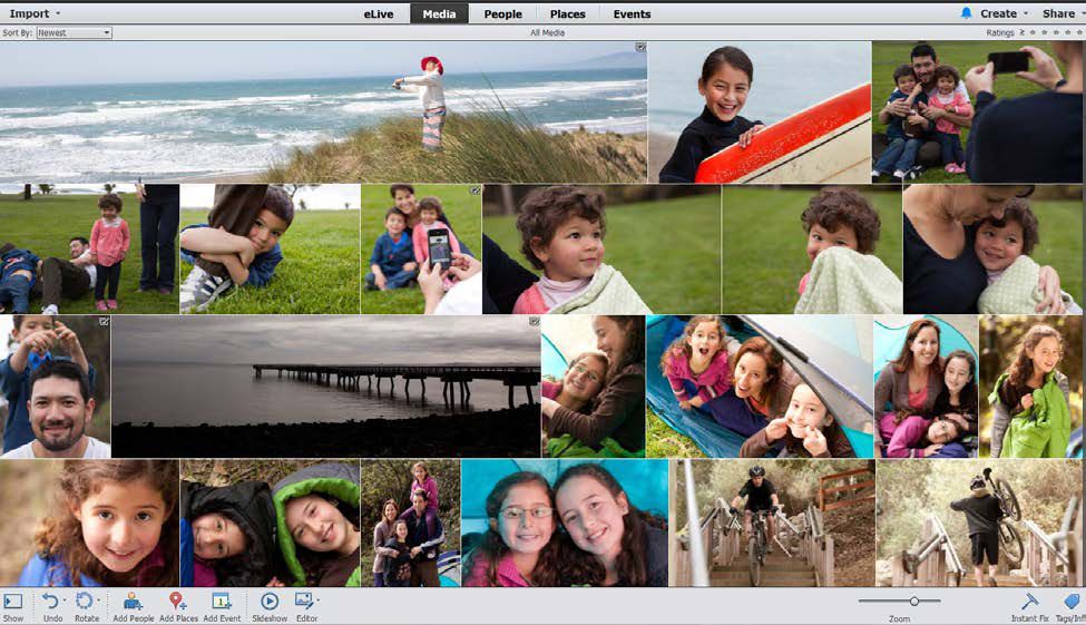 Elements Organizer 13의 기능에는 새로운 미디어 그리드를 대표하는 적응형 그리드가 포함되어 있습니다. 적응형 그리드는 미디어의 모서리와 모서리를 정렬하여 전체 그리드 공간을 빈틈없이 채웁니다. 미디어의 종횡비가 항상 유지되며 산만한 공백이 없습니다.