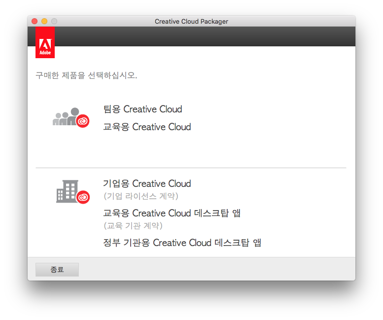 라이선스 유형에 대한 옵션은 기업, 정부기관 또는 교육기관용 Creative Cloud 계정 유형을 사용하는지 또는 Creative Cloud for teams 계정 유형을 사용하는지에 따라 다릅니다.