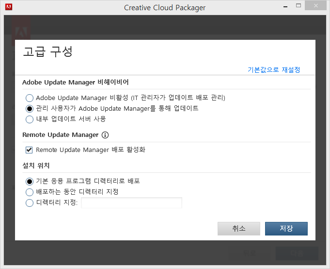 “Apps 패널을 통해 애플리케이션 및 업데이트 표시” 옵션을 선택 해제하면 고급 구성 대화 상자의 “Adobe Update Manager를 통해 관리 사용자 업데이트” 옵션이 선택 해제됩니다. 단, 이 구성 변경 내용은 저장되지 않습니다. 이는 차후에 패키저를 실행하면 “Apps 패널을 통해 애플리케이션 및 업데이트 표시” 옵션이 선택된다는 것을 의미합니다. 또한 “Adobe Update Manager를 통해 관리 사용자 업데이트” 옵션도 표시됩니다.