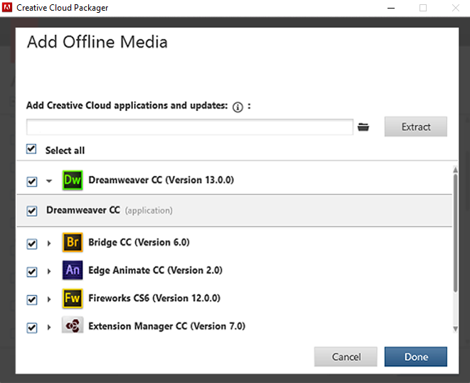 Creative Cloud에서 다운로드하는 대신 DVD 또는 ESD와 같은 로컬 소스에서 애플리케이션 및 업데이트를 추가하려면 [오프라인 미디어 추가]를 클릭합니다.