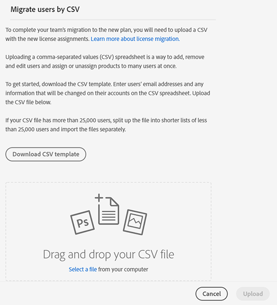 마법사를 사용하여 최대 50명의 사용자를 Creative Cloud for teams Pro 플랜으로 수동으로 마이그레이션할 수 있습니다.