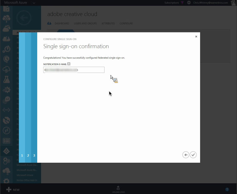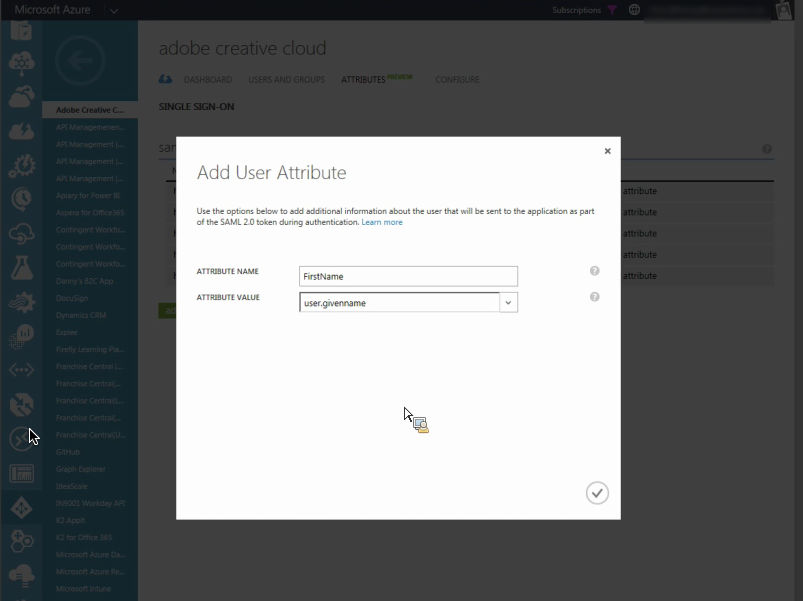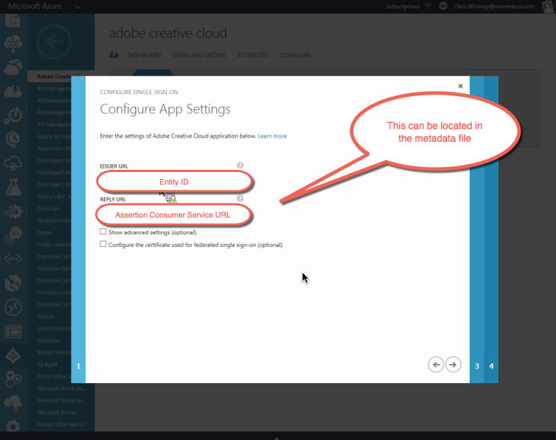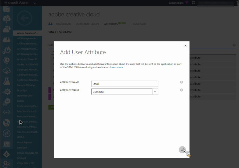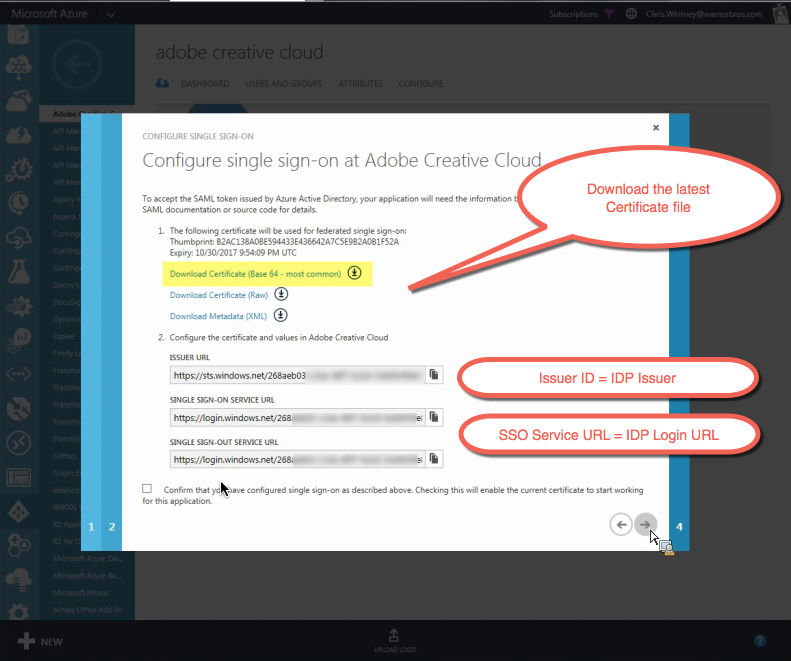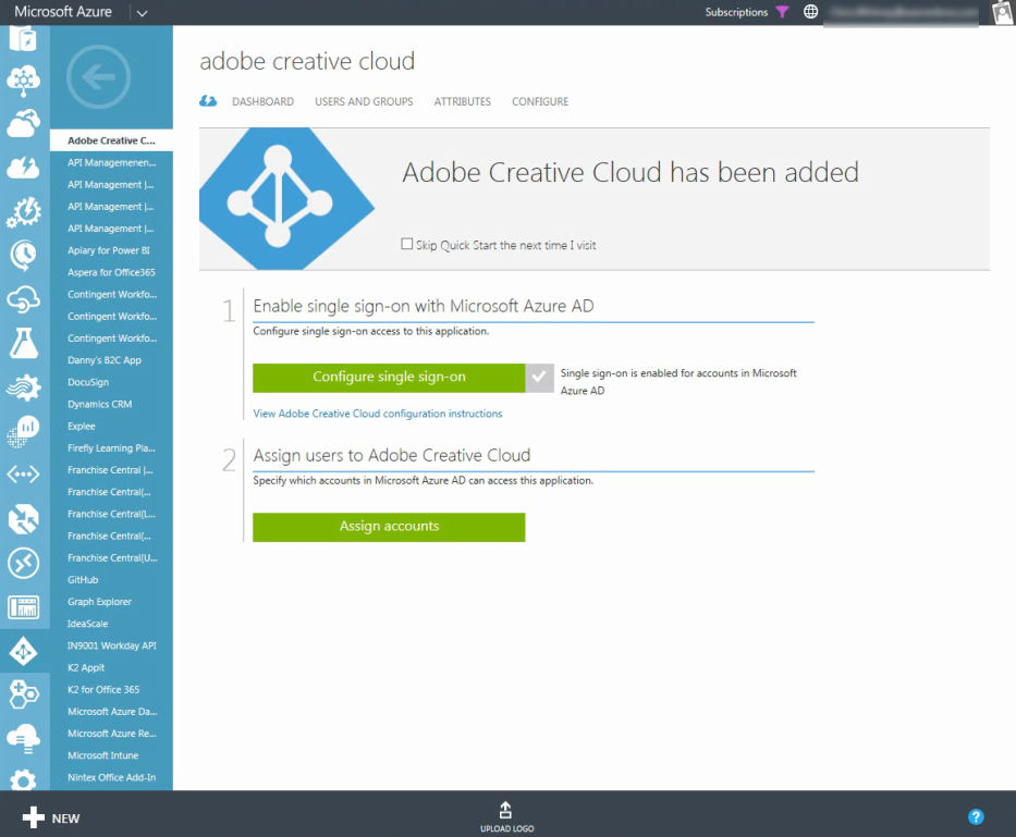 Azure 내에서 Adobe Create Cloud > Single Sign-On 구성으로 이동합니다.