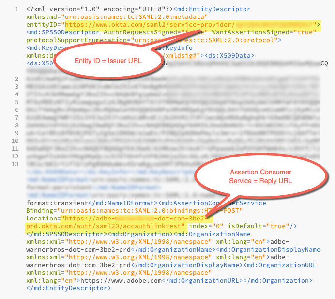 파일에는 Adobe의 EntityID URL 및 AssertionConsumerService URL이 포함되어 있습니다.