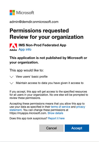 Microsoft Azure Active Directory 전역 관리자 자격 증명으로 Azure에 로그인하고 권한 프롬프트를 수락합니다. Admin Console의 디렉터리 세부 정보로 다시 돌아갑니다.