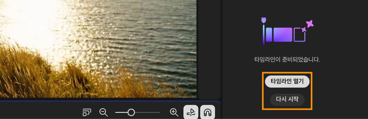 타임라인이 빈 경우 출력이 자동으로 추가됩니다. 타임라인에 이미 콘텐츠가 있는 경우 타임라인 열기를 선택하여 생성된 퀵 컷을 새 창에서 열거나, 다시 시작하기 를 선택하여 프로세스를 다시 시작하세요.